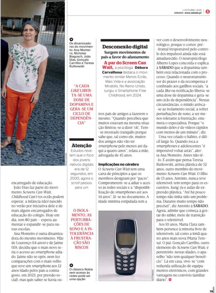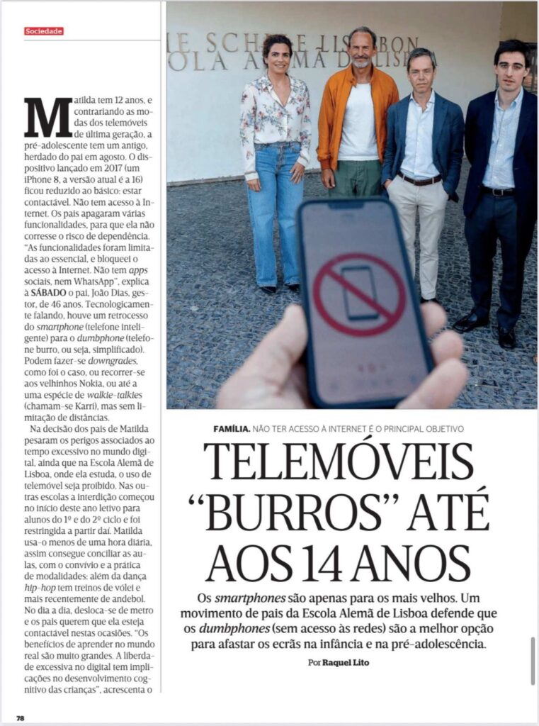 “Os smartphones são apenas para os mais velhos. Um movimento de pais da Escola Alemã de Lisboa defende que os dumbphones (sem acesso às redes) são a melhor opção para afastar os ecrãs na infância e na pré-adolescência.”